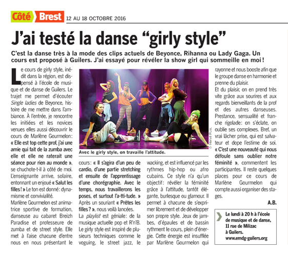 Article paru dans Coté Brest concernant le cours de Girly Style avec Marlène Gourmelon, tous les lundi à 20h à l’EMDG.