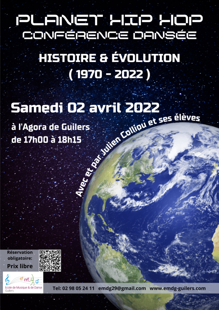 Samedi 2 avril à l’Agora,Guilers, 17h, Julien Colliou, enseignant danse hip hop, danseur, vous donne rendez-vous pour une conférence dansée sur l’histoire et l’évolution de cette danse, mais également cette culture.