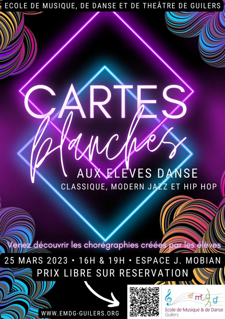 Cartes Blanches aux élèves danse, modern jazz, classique, hip hop, Espace Jean Mobian (ex Agora), le samedi 25 mars à 16h (groupe des petits : billetterie petits ici) 19h (groupe des grands, billetterie ici) prix libre, (jauge limitée) – vérifiez bien dans quel groupe danse votre enfant avant de prendre vos billets.