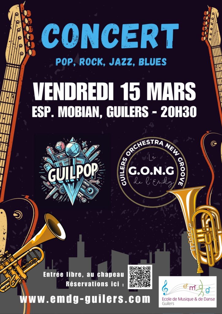 Guilpop, groupe dirigé par Philippe Gouret de l’EMDG, répertoire blues rock, des guitares, des chanteurs et beaucoup de talent et d’énergie (reprises de Jimi Hendrix, Clapton, Cranberries, Blues Brothers, Creedence clearwater revival… ) !