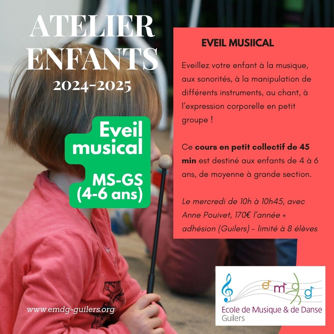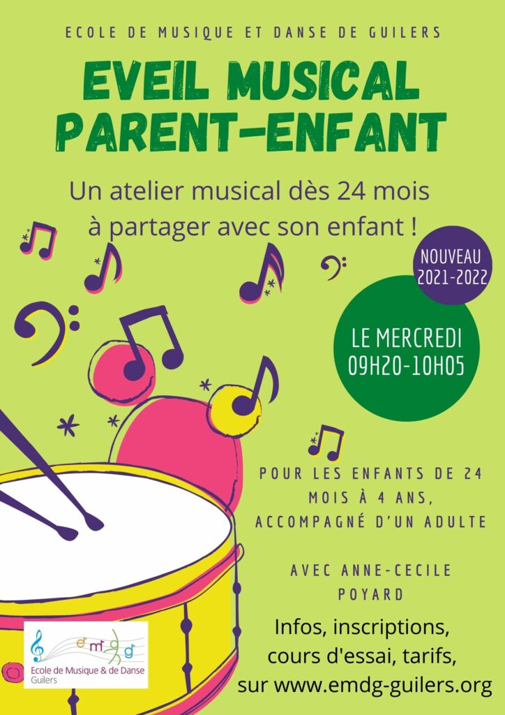 | Eveil musical | Mercredi | 10h-10h45 | Salle d’éveil | 4 à 6 ans, moyenne ou grande section de maternelle |