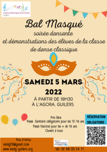 Samedi 5 mars, à 19h30 à l’Agora, le département danse de l’Ecole de Musique et Danse de Guilers vous propose de participer à son bal masqué.