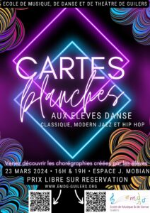 19h : Cartes Blanches grandes – Réservation conseillée sur Helloasso : https://www.helloasso.com/associations/ecole-de-musique-et-danse-de-guilers/evenements/cartes-blanches-danse-grands-2024