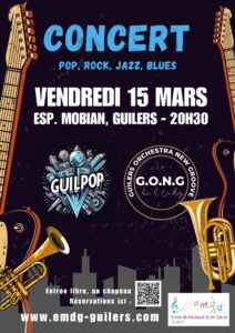 Réservation ici : https://www.helloasso.com/associations/ecole-de-musique-et-danse-de-guilers/evenements/concert-guilpop-et-gong